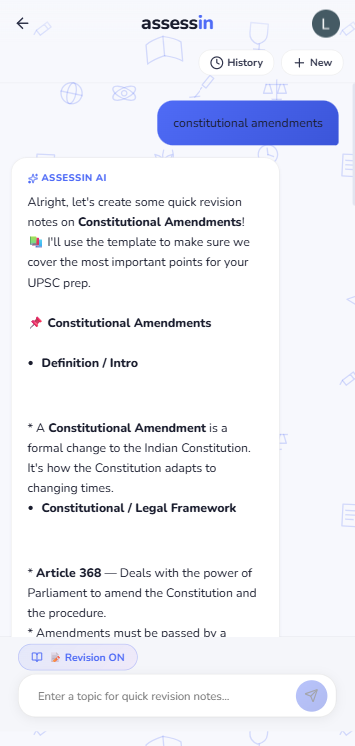 Ask Assessin AI for revision notes on any topic — it generates structured, exam-ready short notes with SC judgements, committee recommendations, data points, and even mnemonics. No fluff, no paragraphs. Just what you need to revise before the exam.
