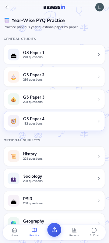 Every question from UPSC Mains GS1, GS2, GS3, GS4 and major optional subjects — from 2013 to 2025. Organised by year, paper, and topic. Pick a question, write your answer, upload, and get evaluated instantly.