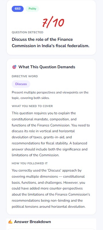 This isn't ChatGPT reading your answer and saying "good job." Our system is trained specifically for UPSC Mains evaluation. It knows the difference between a 4-mark answer and an 8-mark answer. It understands what examiners look for — structure, factual depth, current affairs integration, diagram usage, and that intangible quality of "answer maturity" that toppers have.